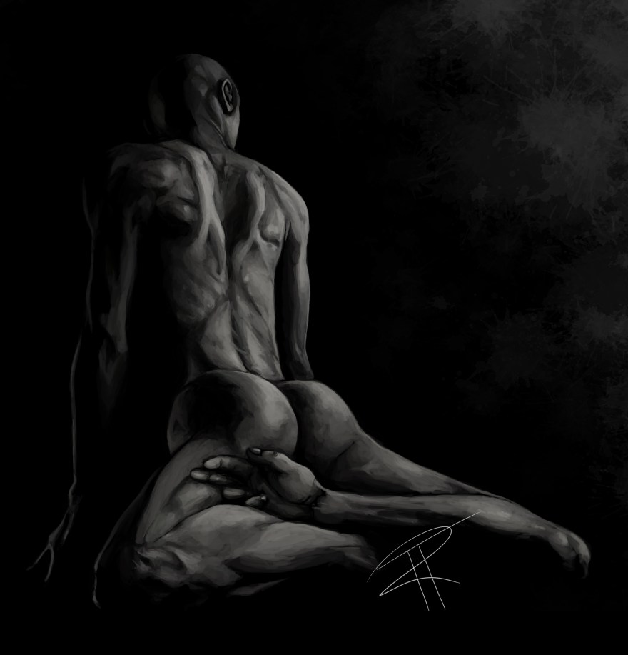 Grayscale painting depicting a human figure facing away from the viewer and sitting reverse, with the front of their hips resting on the ground and propping themselves up on their fully extended arms. Their legs crossed behind them, mimicking a crossed-arms pose. Focuses heavily on the musculature of the back and buttocks. The figure’s feet have been replaced with hands, though only one hand-foot is visible.