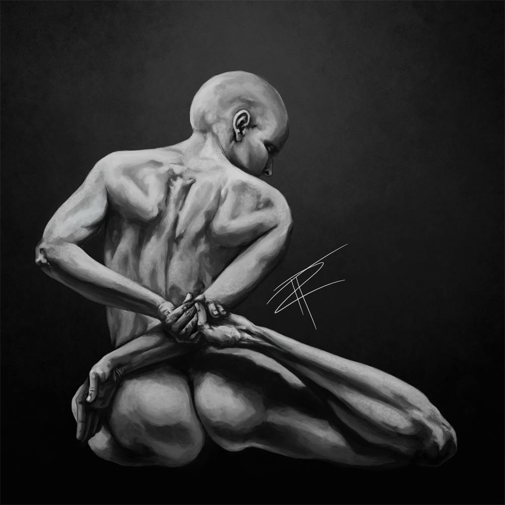 Grayscale painting depicts a human figure facing away from the viewer and seated on the ground with both arms crossed behind their back and one leg bent backward. The figure’s feet have been replaced with hands; the figure’s right (viewer’s left) hand is clasping the hand-foot of the figure’s left (viewer’s right) leg. Focuses on the musculature of the back and shoulders and the clasped hands.