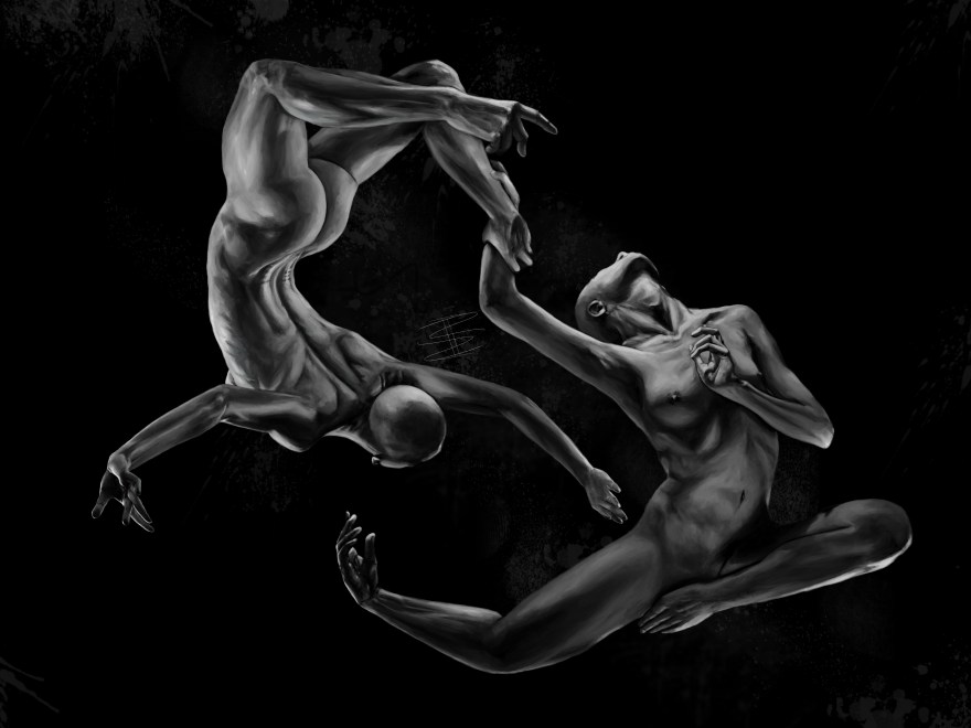 Grayscale painting depicts two nude human figures, floating in midair holding hands/limbs, forming a “wheel” or circle out of their bodies. The figures’ feet have been replaced with hands. This painting can be oriented with any side as “up.”